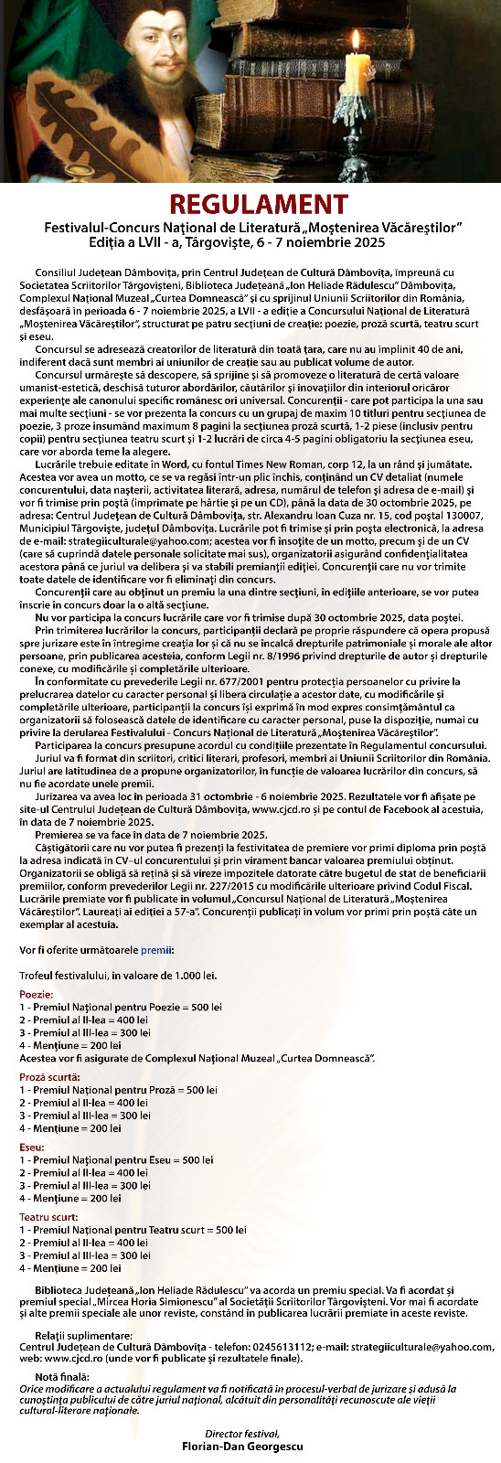Consiliul Judeţean Dâmboviţa, prin Centrul Judeţean de Cultură Dâmboviţa, împreună cu Societatea Scriitorilor Târgovişteni, Biblioteca Judeţeană „Ion Heliade Rădulescu” Dâmbovița, Complexul Naţional Muzeal „Curtea Domnească” şi cu sprijinul Uniunii Scriitorilor din România, desfăşoară în perioada 6 – 7 noiembrie 2025, a VII - a ediţie a Concursului Naţional de Literatură „Moştenirea Văcăreştilor”, structurat pe patru secţiuni de creaţie: poezie, proză scurtă, teatru scurt şi eseu.