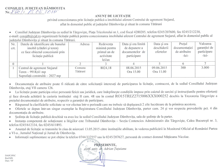 ANUNŢ DE LICITAŢIE privind concesionarea prin licitație publică a imobilului aferent Centrului de agrement Stejarul, aflat în domeniul public al judeţului Dâmboviţa şi situat în comuna Tătărani
