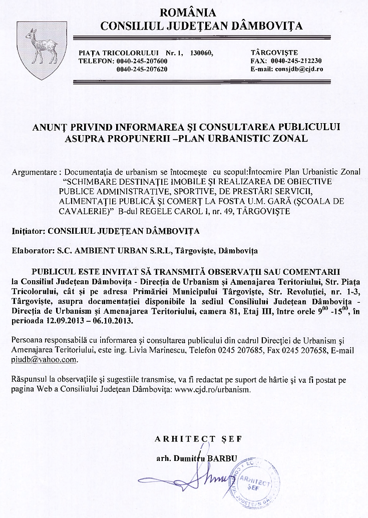 Anunț privind informarea și consultarea publicului asupra propunerii - Planul urbanistic zonal U.M. Gara