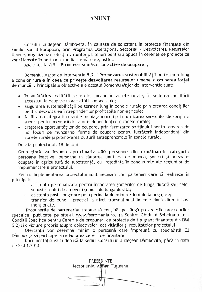 Anunț privind selecția viitorilor parteneri pentru a aplica în cererile de proiecte ce vor fi lansate în perioada imediat următoare