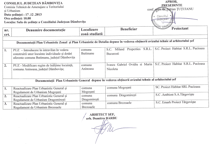 Documentatiile supuse avizarii in sedinta CTATU din data de 17.12.2013