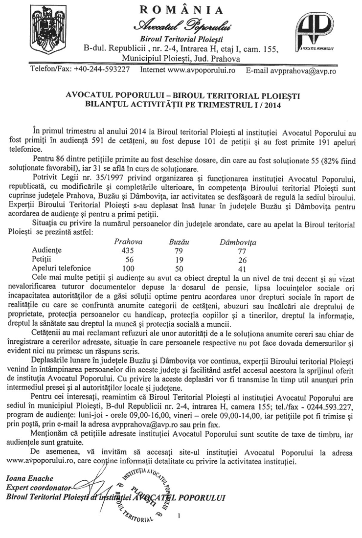 AVOCATUL POPORULUI - BIROUL TERITORTAL - PLOIEȘTI Bilanțul activității pe trimestrul I / 2014