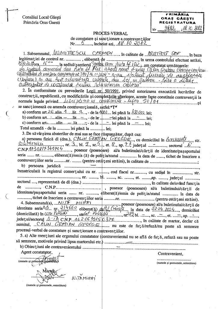 Proces verbal de constatatre a contravențiilor nr. 5 din 18.10.2012 - Primaria Găești