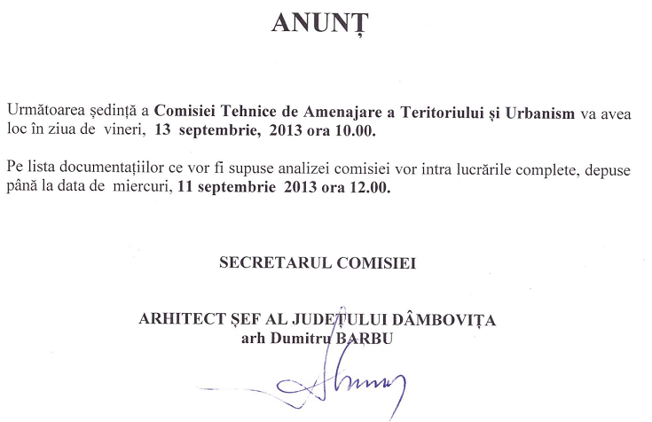 Sedința Comisiei tehnice de amenajarea teritoriului și urbanism va avea loc in ziua de 13 septembrie 2013