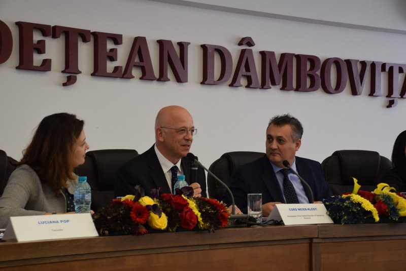 Ulterior acestui moment, însoțit de membri importanți ai instituțiilor de legătură dintre România și Germania, respectiv directorul Camerei de Comerț Româno-Germane – Sebastian Metz și șefa secției economice a Ambasadei Germaniei la București – Swantje Kortemeyer, domnul ambasador a participat la o întâlnire cu reprezentanți ai companiilor cu capital german din județul Dâmbovița, în cadrul căreia a fost supusă atenției, ca principal subiect, relația economică româno-germană. Desfășurat în sala Unirii a Consiliului Județean Dâmbovița, la eveniment au mai participat atât reprezentanți ai mediului de afaceri autohton, cât și ai unităților administrativ-teritoriale din județul Dâmbovița.