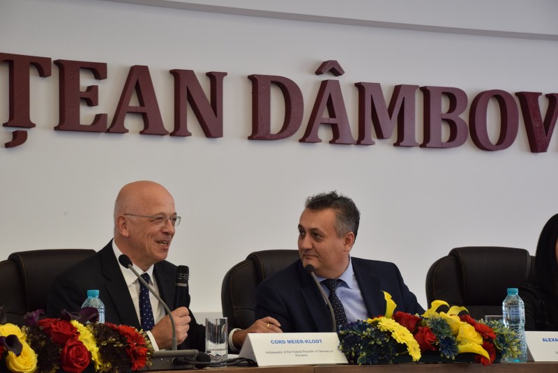 La rândul său, Excelența Sa a precizat că județul Dâmbovița este important pentru autoritățile și investitorii germani, iar parteneriatul româno-german dintre Automecanica Moreni și Rheinmetall este o dovadă puternică a acestui aspect. Deși principalul subiect al discuțiilor a fost domeniul economic, îndeosebi oportunități de investiții și colaborare între cele două părți, Excelența Sa a confirmat faptul că există preocupare din partea statului german pentru România și în domeniile strategic, educațional și cultural, declarându-se, astfel, încântat de colaborarea și receptivitatea românilor în acest sens. În urma discuțiilor purtate, E.S. Cord Meier-Klodt a asigurat autoritățile județene și agenții economici dâmbovițeni de întreaga deschidere a părții germane pentru dezvoltarea relațiilor bilaterale, a investițiilor comune și a contactelor cu parteneri germani, bazate pe încredere și sprijin reciproc: „Mărturisesc că sunt cu adevărat impresionat. Este prima mea vizită în Județul Dâmbovița și în orașul Târgoviște. Nu-mi amintesc de o altă asemenea primire – substanțială, concretă. Vă mulțumesc foarte mult! Este o vizită pe care o dedicăm unei întregi serii de subiecte, dintre care continuarea dezvoltării relațiilor bilaterale în plan educațional, și anume promovarea învățării limbii germane, a schimburilor universitare, a educației profesionale. Motivul principal al acestei vizite este continuarea dezvoltării relațiilor economice, lucru ce justifică și prezența celorlalți membrii ai delegației germane. Economia românească prezintă o creștere importantă, iar noi ne dorim ca lucrurile să continue în acest sens, economia germană fiind interesată să dezvolte în continuare această relație economică bilaterală. În Județul Dâmbovița, sunt companii cu capital german care au creat numeroase locuri de muncă, precum CarpatCement sau Sun Garden și altele. Sunt impresionat de ce am auzit și văzut la dumneavoastră, de acest incredibil potențial economic și atât eu, cât și colegii mei suntem dispuși să îl susținem și să îl dezvoltăm. Ne bazăm pe disponibilitatea partenerilor noștri de a face posibil acest angajament economic (locuri de muncă pentru personal calificat, infrastructură de transport etc.).”