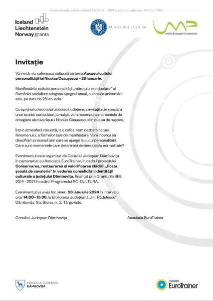 „Apogeul cultului personalității” face parte din seria de manifestări culturale organizate prin Proiectul „Conservarea, restaurarea și valorificarea clădirii Fosta Școală de Cavalerie din Târgoviște, în vederea consolidării identității culturale a județului Dâmbovița”, finanțat prin Granturile SEE 2014 – 2021, în cadrul Programului RO-CULTURA.
