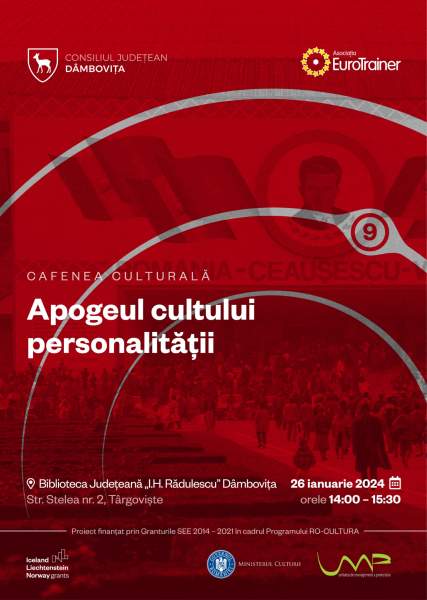 Toți cei interesați sunt așteptați cu drag vineri, 26 ianuarie 2024, ora 14:00, la Biblioteca Județeană I. H. Rădulescu Târgoviște, pentru a participa la cafeneaua culturală „Apogeul cultului personalității”, temă concentrată pe personalitatea celui care a condus România în perioada 1965 - 1989, Nicolae Ceaușescu.