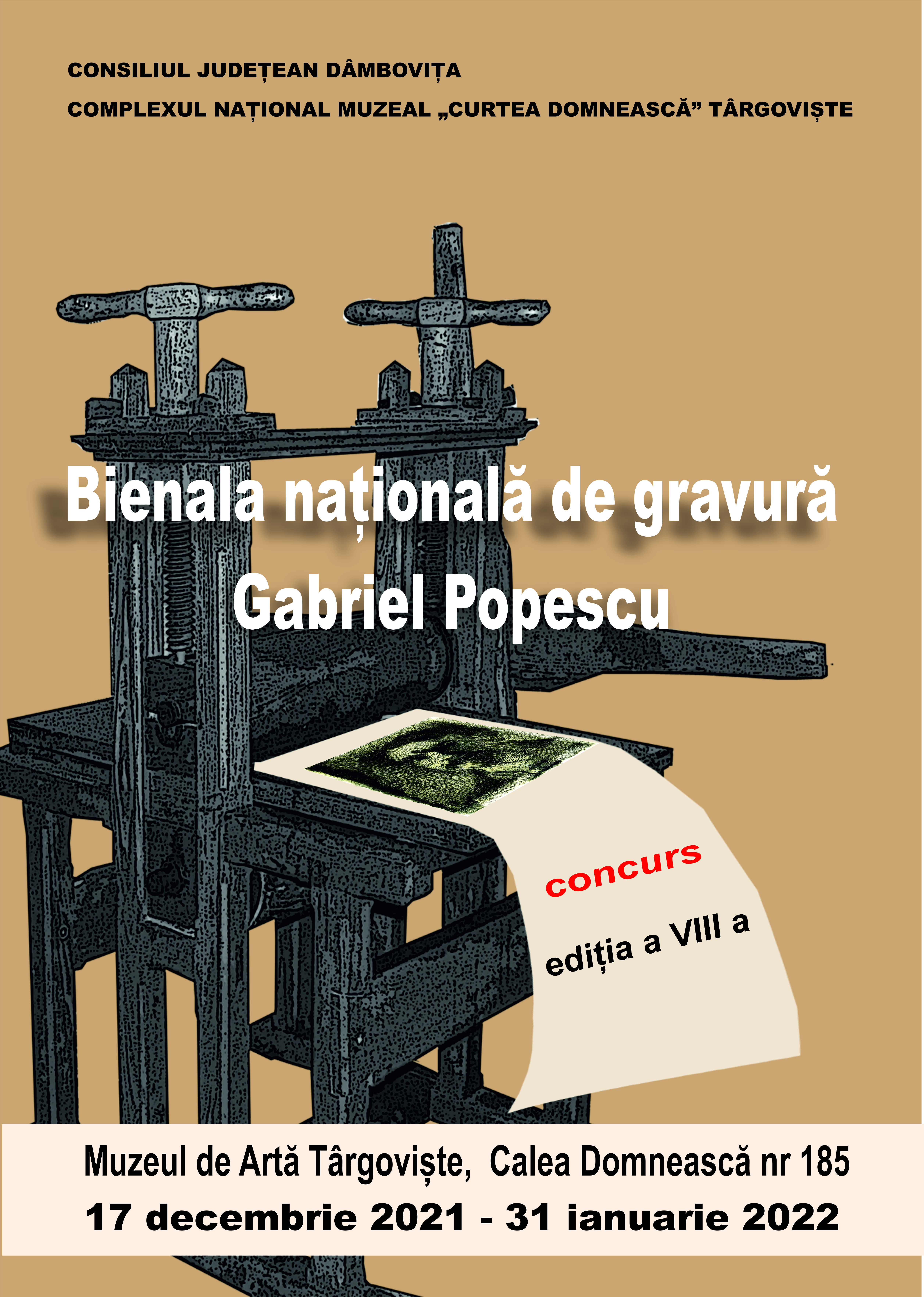 Consiliul Județean Dâmbovița, prin Complexul Național Muzeal „Curtea Domnească” Târgoviște, vă invită la cea de-a VIII-a ediţie a Bienalei Naţionale de Gravură „Gabriel Popescu”. Bienala poartă numele primului mare gravor, născut pe meleaguri dâmbovițene, care a locuit și a creat – în casa atelier de la Vulcana Pandele, unde se află unica presă din lemn, cu valțuri, pentru imprimat gravuri în metal, din România.