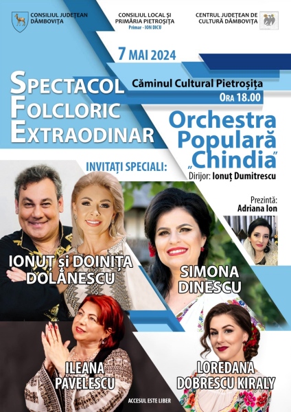 Ionuț și Doinița Dolănescu, solistele Simona Dinescu, Loredana Dobrescu Kiraly și Ileana Pavelescu vor crea o atmosferă plină de energie, începând cu ora 18:00, la Căminul Cultural Pietroșița.
