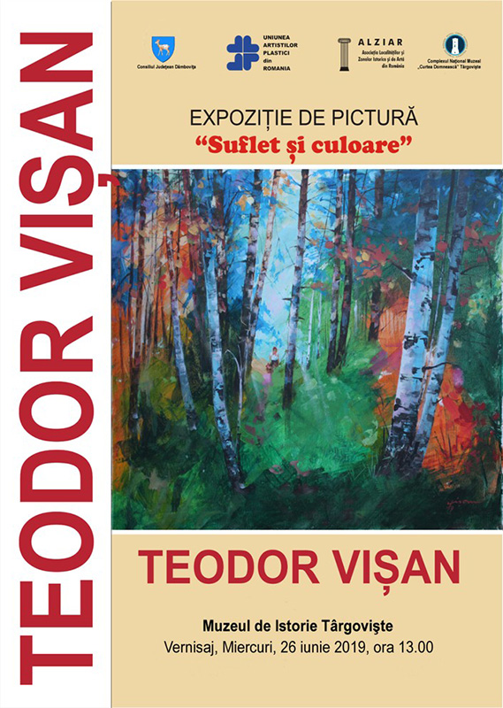 Consiliul Judeţean Dâmboviţa, Uniunea Artiştilor Plastici din România, Asociaţia Localităţilor şi Zonelor Istorice şi de Artă din România şi Complexul Naţional Muzeal “Curtea Domnească” Târgovişte, vă invită să participaţi alături de pictorul Teodor Vişan, la vernisajul expoziţiei de pictură „Suflet şi culoare”. Evenimentul va avea loc miercuri, 26 iunie 2019, începând cu ora 13.00, la Muzeul de Istorie din strada Calea Domnească, nr. 189.