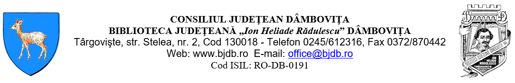 În perioada 23-27 noiembrie 2020, Biblioteca Judeţeană „I. H. Rădulescu” Dâmboviţa organizează Zilele Bibliotecii.