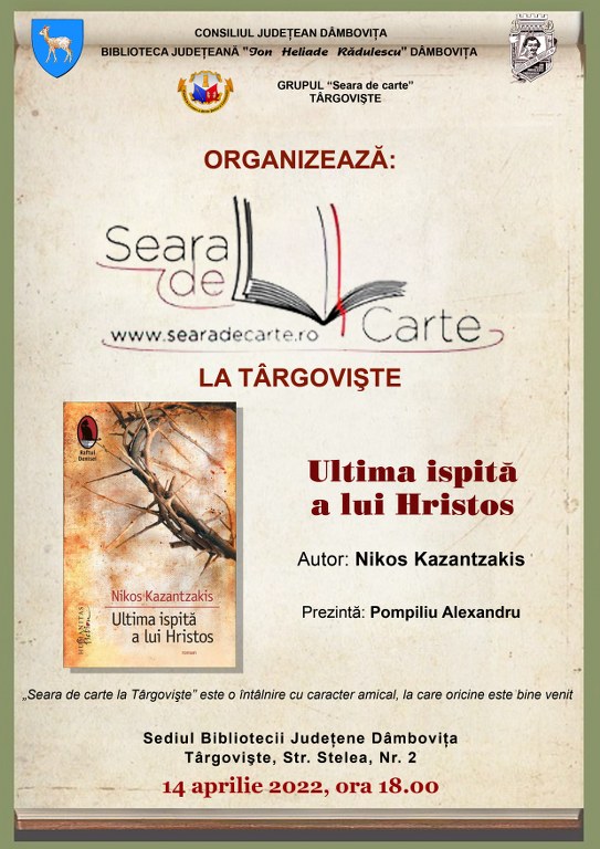 Cartea propusă spre dezbatere este „Ultima ispită a lui Hristos”, autor Nikos Kazantzakis.