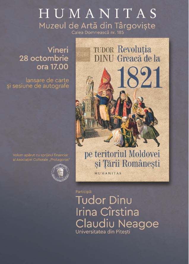 Vineri, 28 octombrie 2022, ora 17:00, în Sala de Consiliu a Muzeului de Artă din Târgoviște, va avea loc lansarea volumului „Revoluția Greacă de la 1821 pe teritoriul Moldovei și Țării Românești”, semnat de prof. univ. dr. Tudor Dinu, profesor abilitat al Universității din București, unde predă limba, literatura şi civilizaţia greacă, și doctor honoris causa al Universității Democrit a Traciei (Grecia). Lucrările sale - dedicate unor teme de filologie, istorie, civilizație greacă veche, bizantină şi postbizantină, dar şi elenismului din Țările Române - au fost tipărite în România, Grecia, Cipru, Franţa, Cehia, Letonia, Ucraina şi Georgia. La Editura Humanitas a publicat volumele „Mihai Viteazul, erou al eposului grec” (2008), „Dimitrie Cantemir şi Nicolae Mavrocordat - rivalităţi politice şi literare la începutul secolului al XVIII-lea” (2011), „Bucureștiul fanariot. Biserici, ceremonii, războaie” (2015), „Bucureștiul fanariot. Administrație, meșteșuguri, negoț” (2017), „Oamenii epocii fanariote. Chipuri din bisericile Țării Românești și Moldovei” (2018); aceasta din urmă a fost distinsă, în varianta greacă, cu premiul Academiei din Atena. În Duminica de Florii a anului 2018, a fost înnobilat la Constantinopol de către Sanctitatea Sa Patriarhul Ecumenic Bartolomeu, care i-a acordat titlul bizantin de archón hypomnematógraphos.