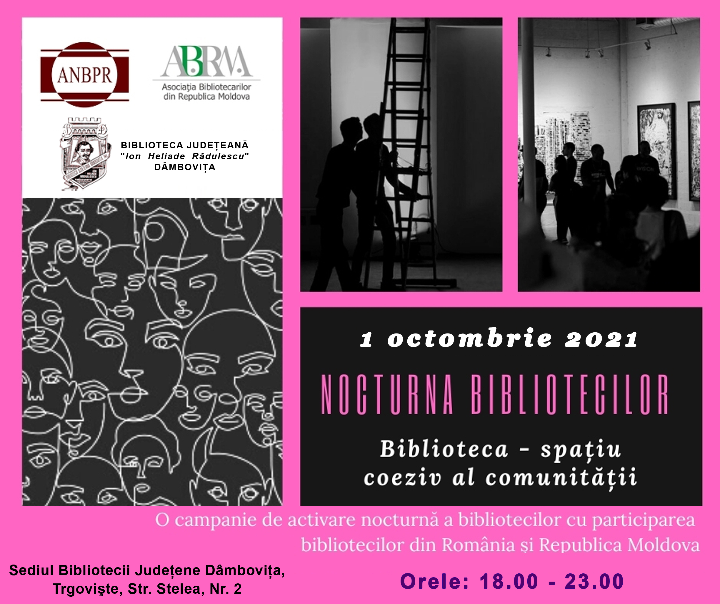 Vineri, 1 octombrie 2021, orele 18.00-23.00, Biblioteca Judeţeană „I. H. Rădulescu” Dâmboviţa vă invită la „Nocturna bibliotecilor: Biblioteca - spaţiu coeziv al comunităţii”.