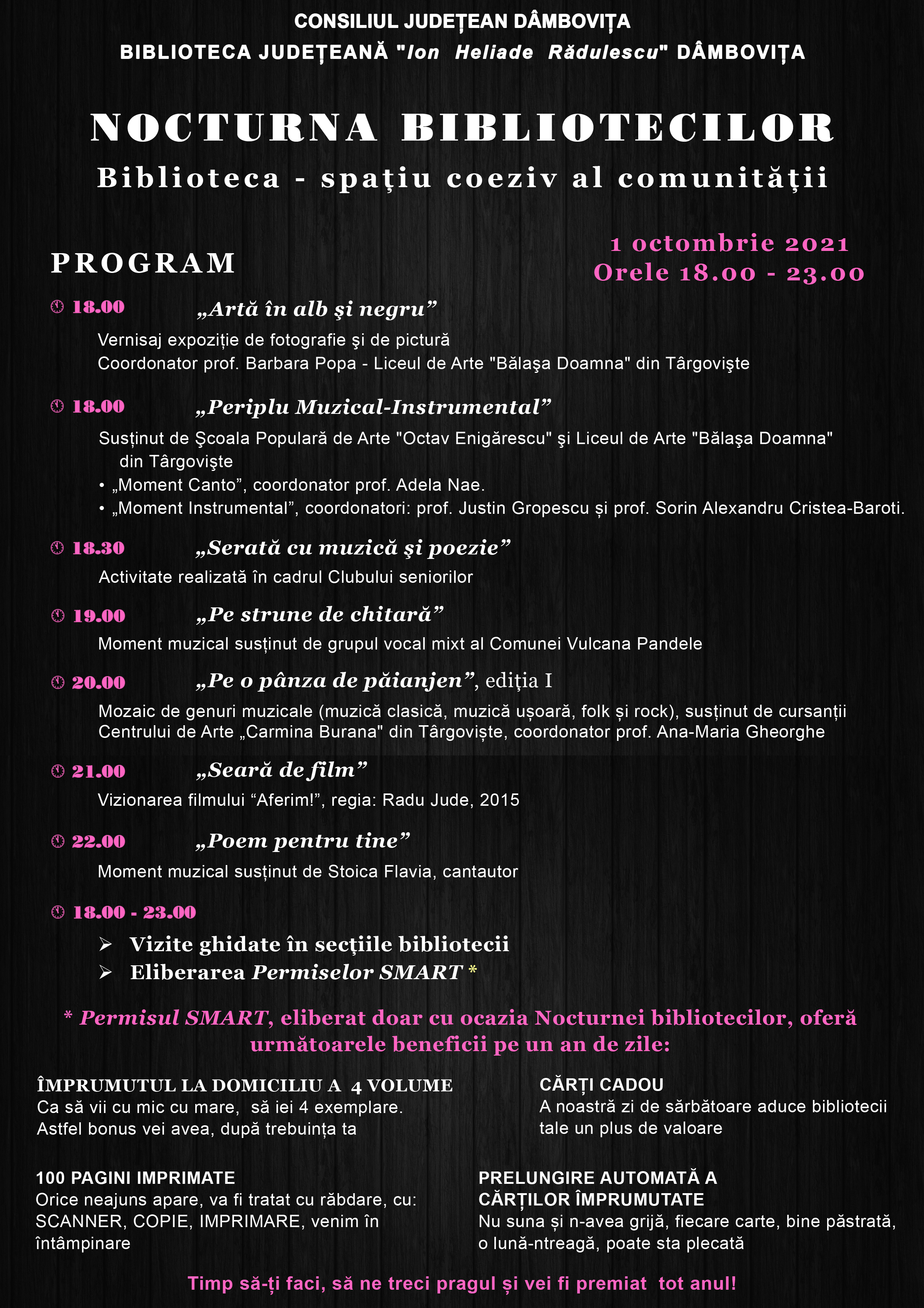 * Permisul SMART, eliberat doar cu ocazia Nocturnei bibliotecilor, oferă următoarele beneficii pe un an de zile: