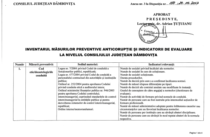 INVENTARUL MĂSURILOR PREVENTIVE ANTICORUPȚIE ȘI INDICATORII DE EVALUARE LA NIVELUL CONSILIULUI JUDEȚEAN DÂMBOVIȚA