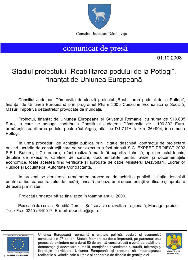 Stadiul proiectului Reabilitarea podului de la Potlogi